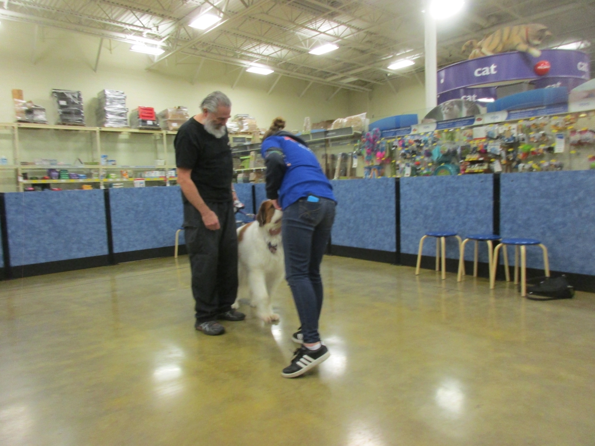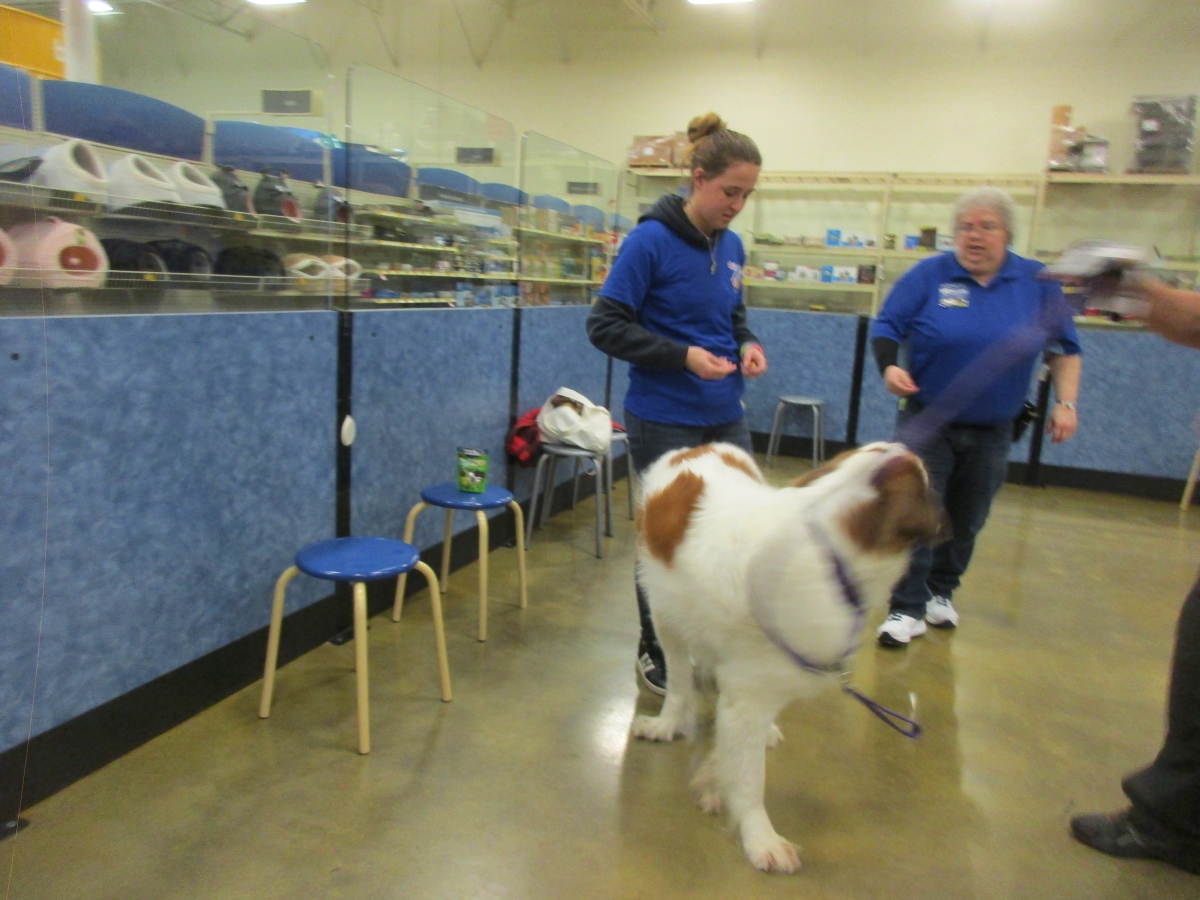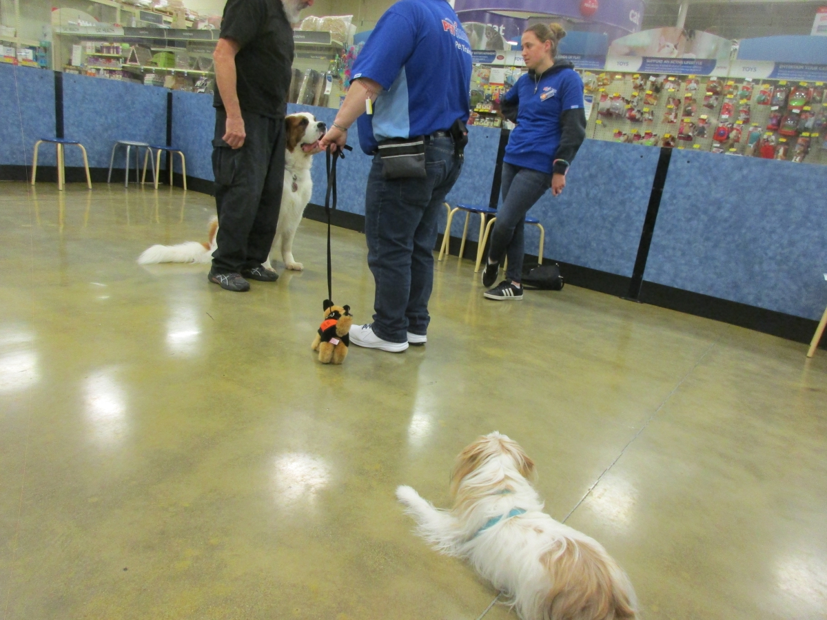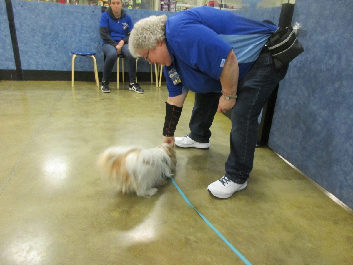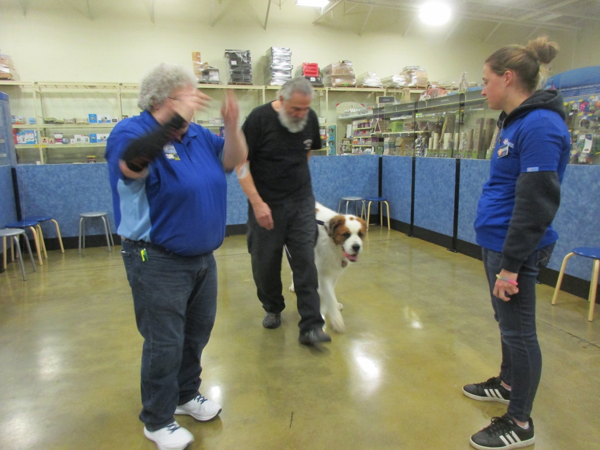 Penny helps Jamie's training of Cat, a new trainer from the Vacaville Petsmart, in the proper way