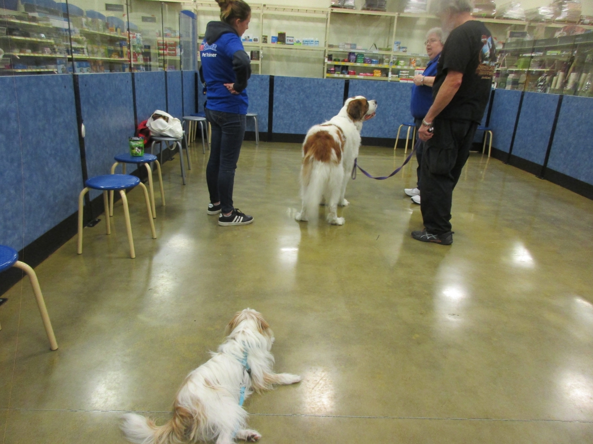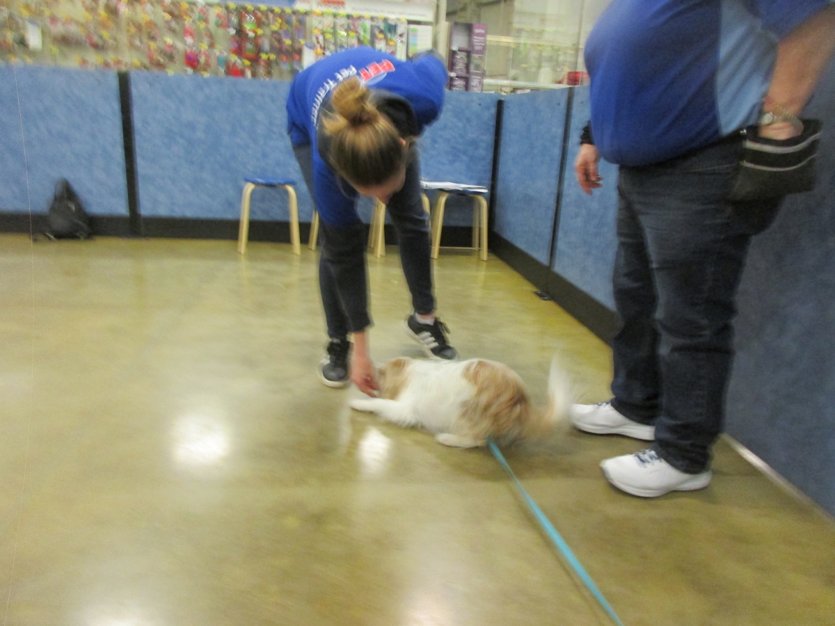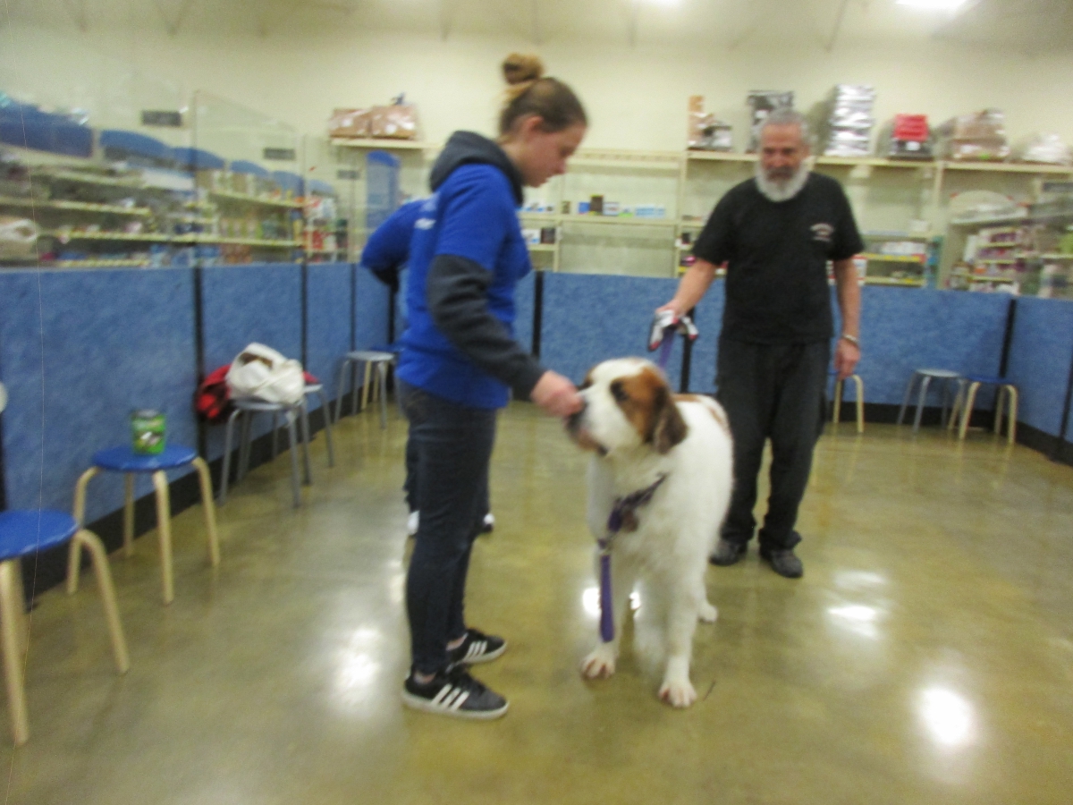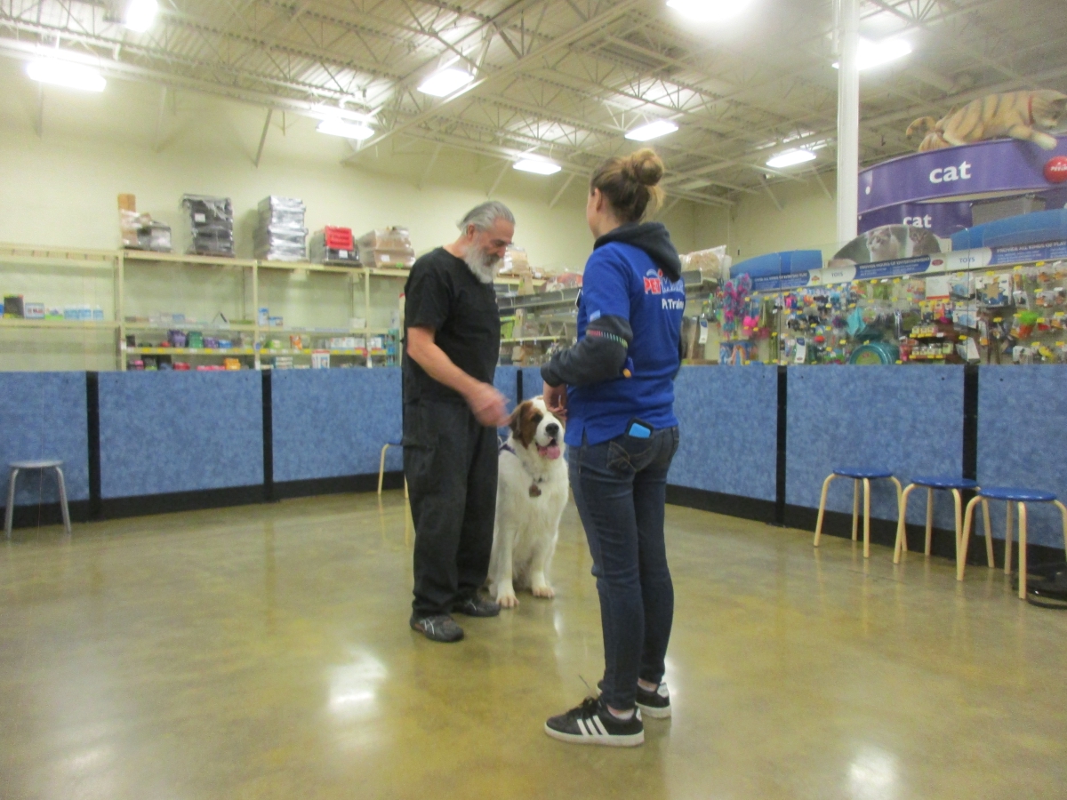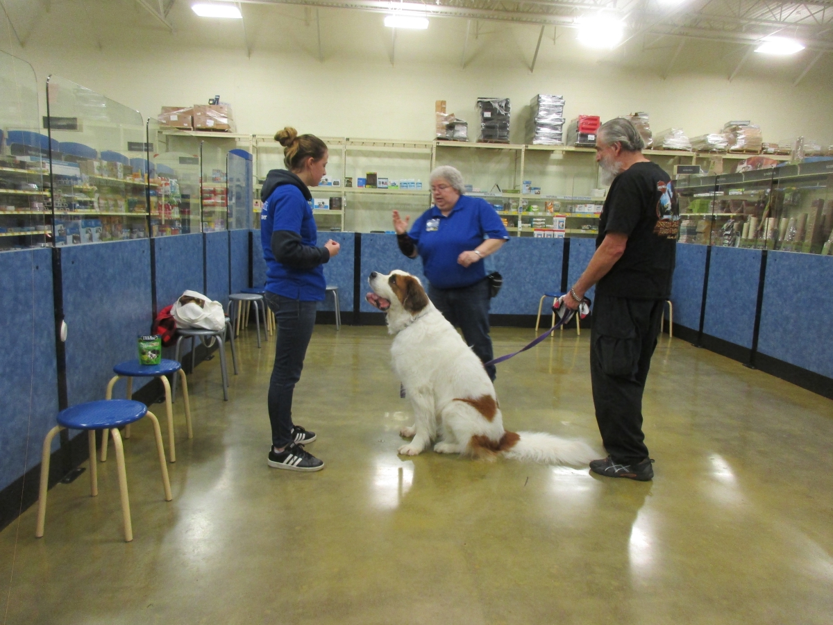 Penny helps Jamie's training of Cat, a new trainer from the Vacaville Petsmart, in the proper way