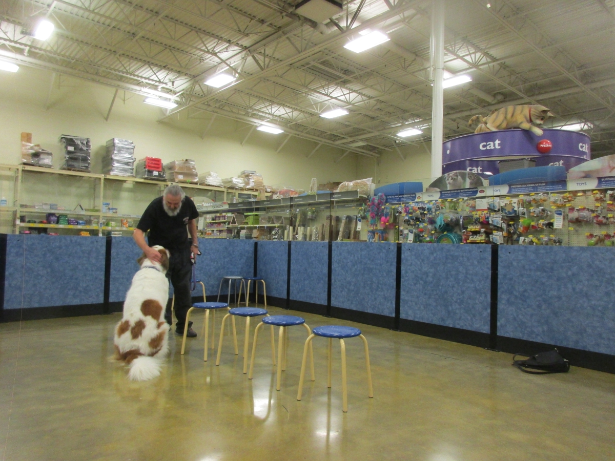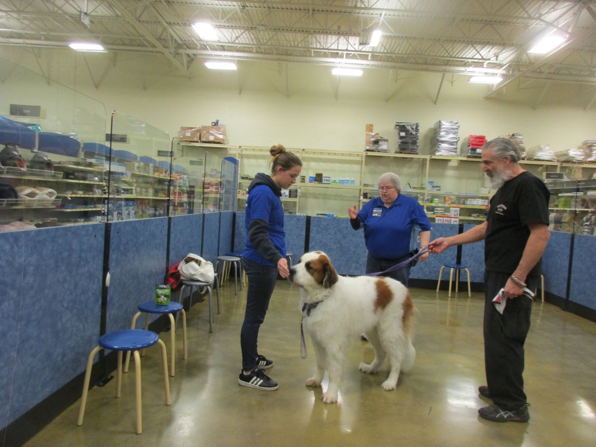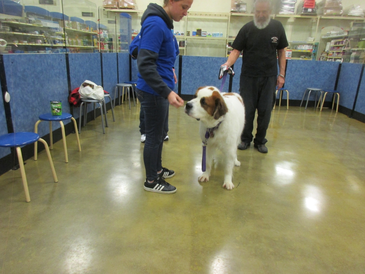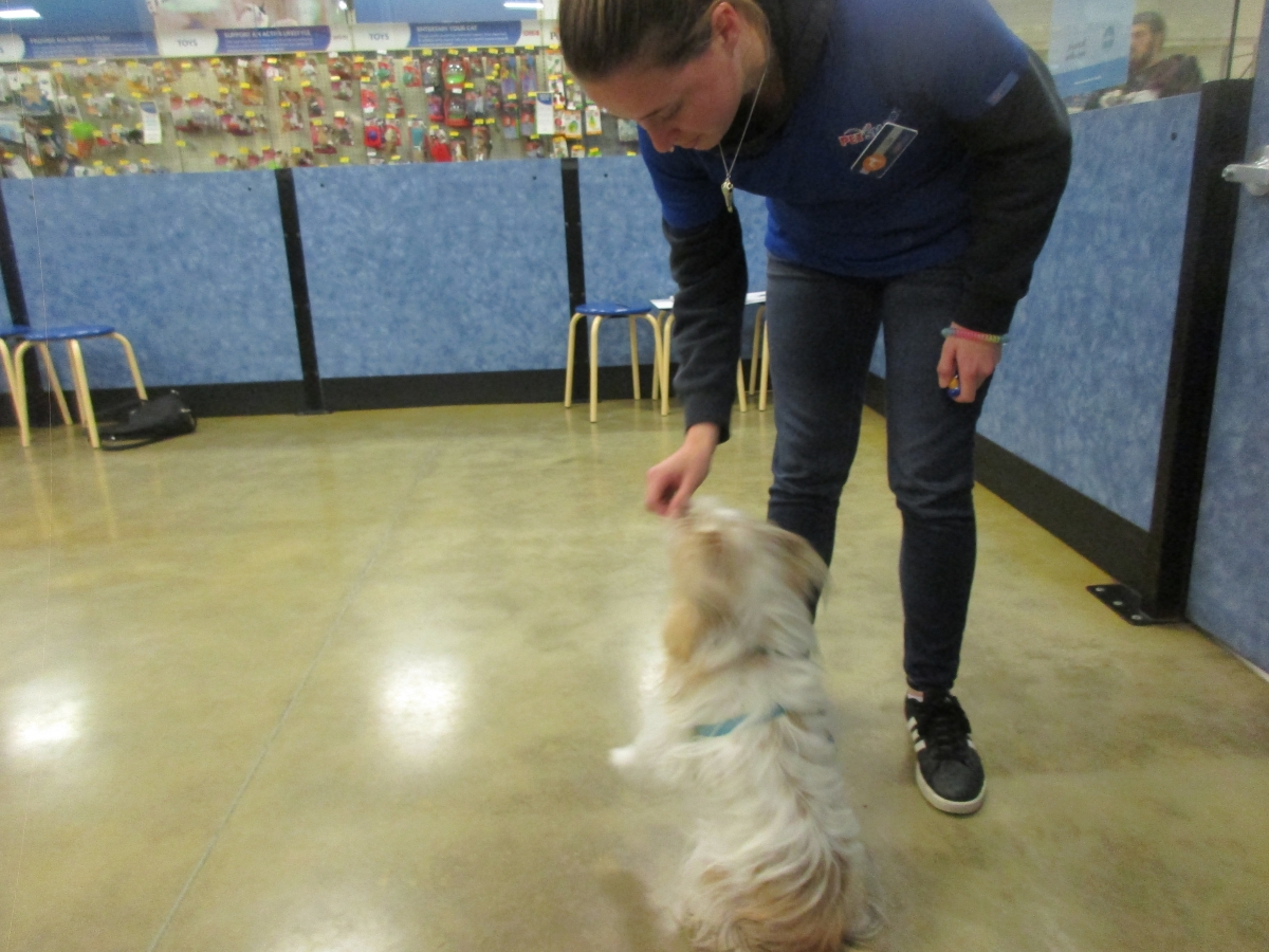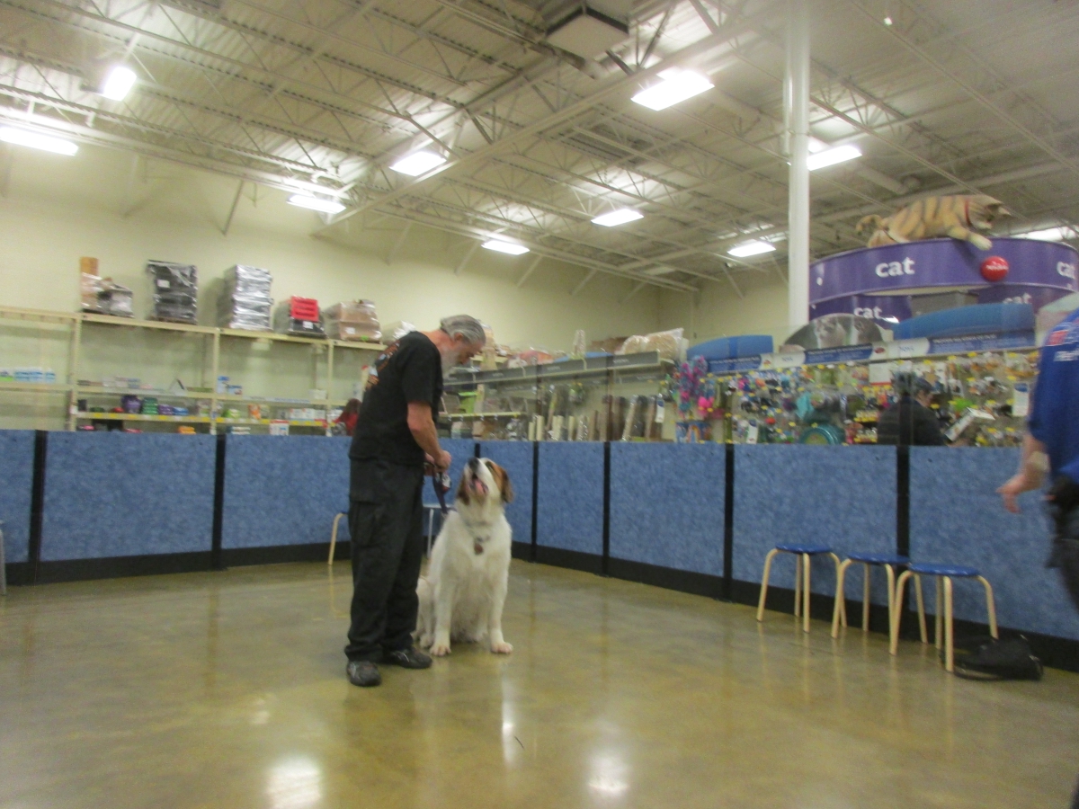 Penny helps Jamie's training of Cat, a new trainer from the Vacaville Petsmart, in the proper way